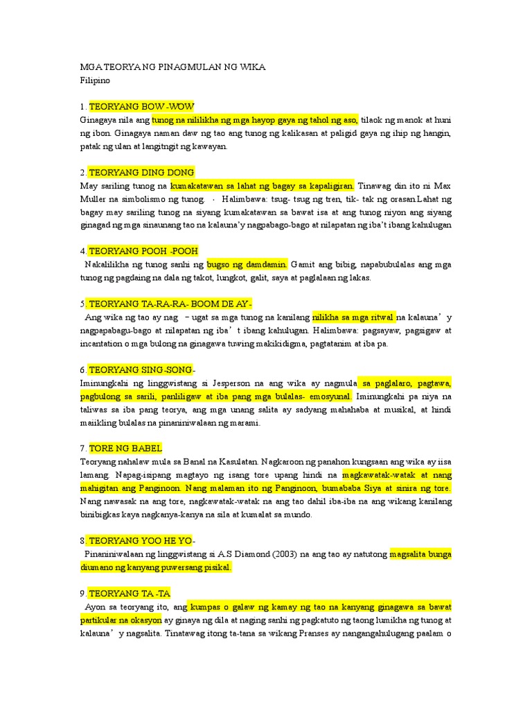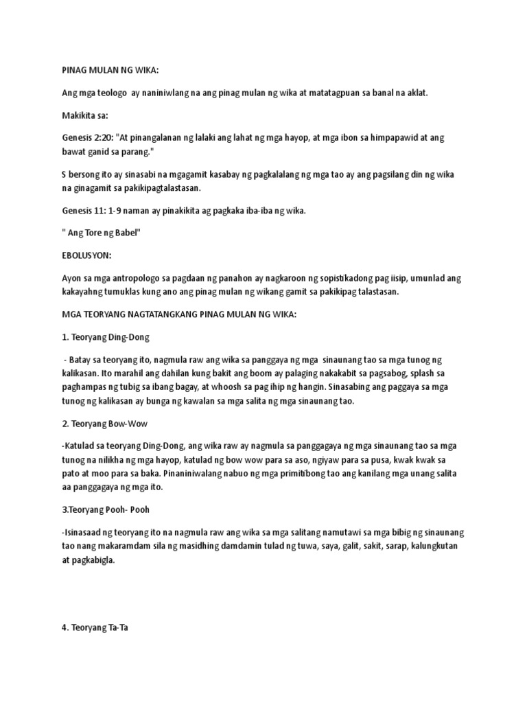 Teoryang Bow-Wow Katulad ng Teoryang Ding-Dong ang wika raw ay nagmula sa panggagaya ng mga sinauang tao sa mga tunog na nilikha ng mga hayop katulad ng bow-wow para sa aso ngiyaw para sa pusa kwak-kwak para sa pato at moo para sa baka. Pinaniniwalaang dito nagmula ang salitang ito sapagkat nakagagawa ito ng ibat ibang kombinasyon ng tunog na nagagamit upang makapaghatid ng damdamin o ekspresyon. Teoryang Mama - nagsasaad na ang wika ay nagmula sa mga pinakamadaling pantg ng mahahalagang bagay.